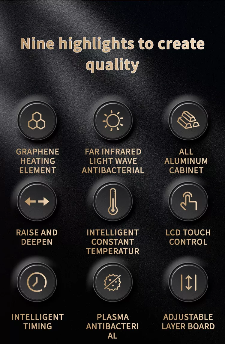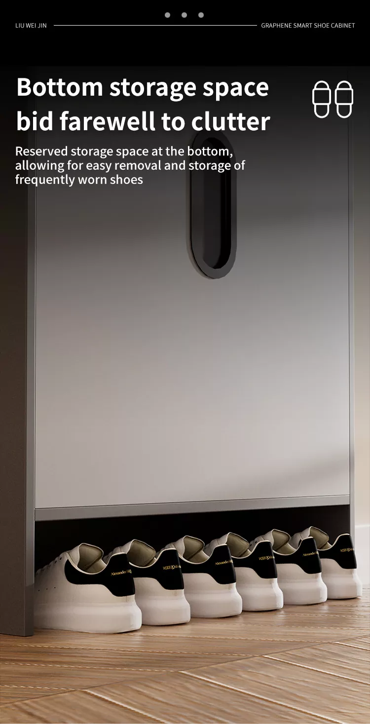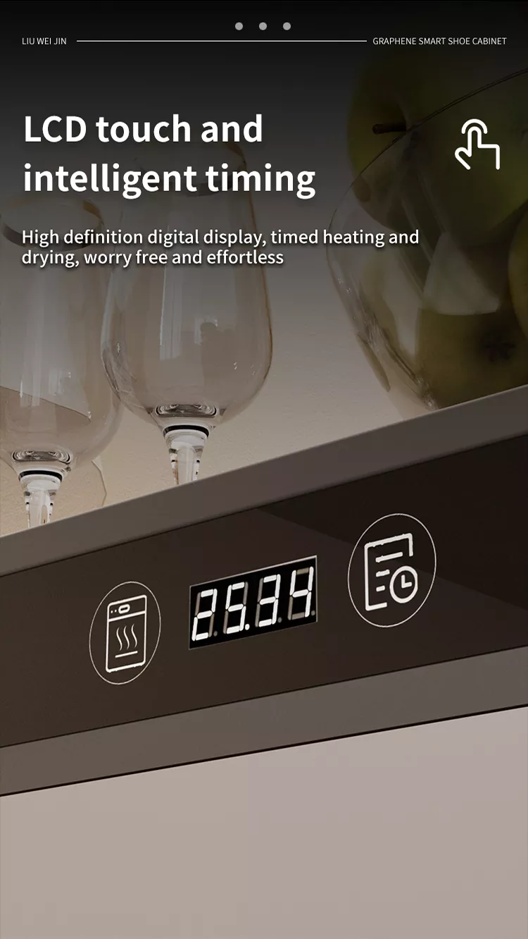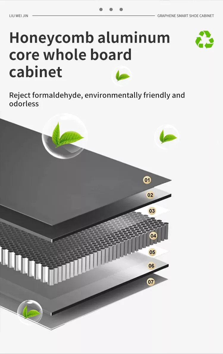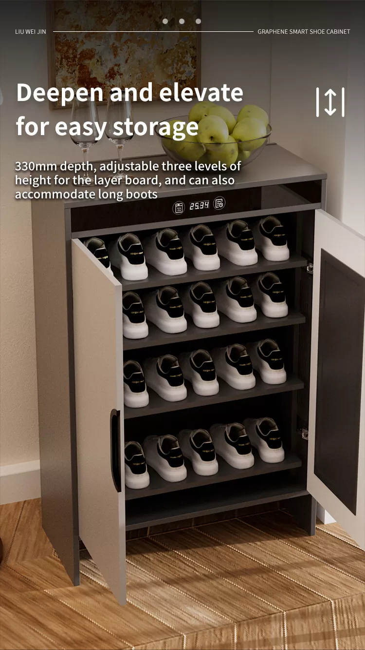 Come pioniere della vita del grafene, Meshow conferma il concetto di "nuovi materiali, nuove tecnologie e nuova vita". Questo mobile per scarpe da scarpe di taglio del riscaldamento elettrico di grafene è personalizzato. Questo prodotto utilizza un elemento di riscaldamento del grafene. Il grafene è noto come materiale in oro nero, che è un materiale naturale separato dagli atomi di carbonio. Ha le caratteristiche del riscaldamento rapido di millisecondi e il grafene ha onde di luce a infrarossi lontane benefiche al corpo umano, che può efficacemente sterilizzare durante il riscaldamento. Allo stesso tempo, non causerà l'aria troppo asciutta e danneggia le scarpe. It is equipped with ion purification module, which has deodorization effect.Two large-area graphene heating modules are designed on the left and right sides of the shoe cabinet, which can be well and evenly dried.The shoe cabinet laminates can be adjusted freely, and each layer of laminates can be taken down freely to meet the needs of shoes with different heights.With LCD display screen, you can easily complete the timing operation, intuitively see La temperatura e l'orario di lavoro e risparmia anche l'elettricità per te. L'armadio delle scarpe è realizzato con piastra in alluminio a nido d'ape ad alta resistenza, che è ecologica e priva di formaldeide. Allo stesso tempo, ha un'elevata capacità di carico e non si accumulerà a causa del tempo umido. Non si romperà a causa del riscaldamento a lungo termine.