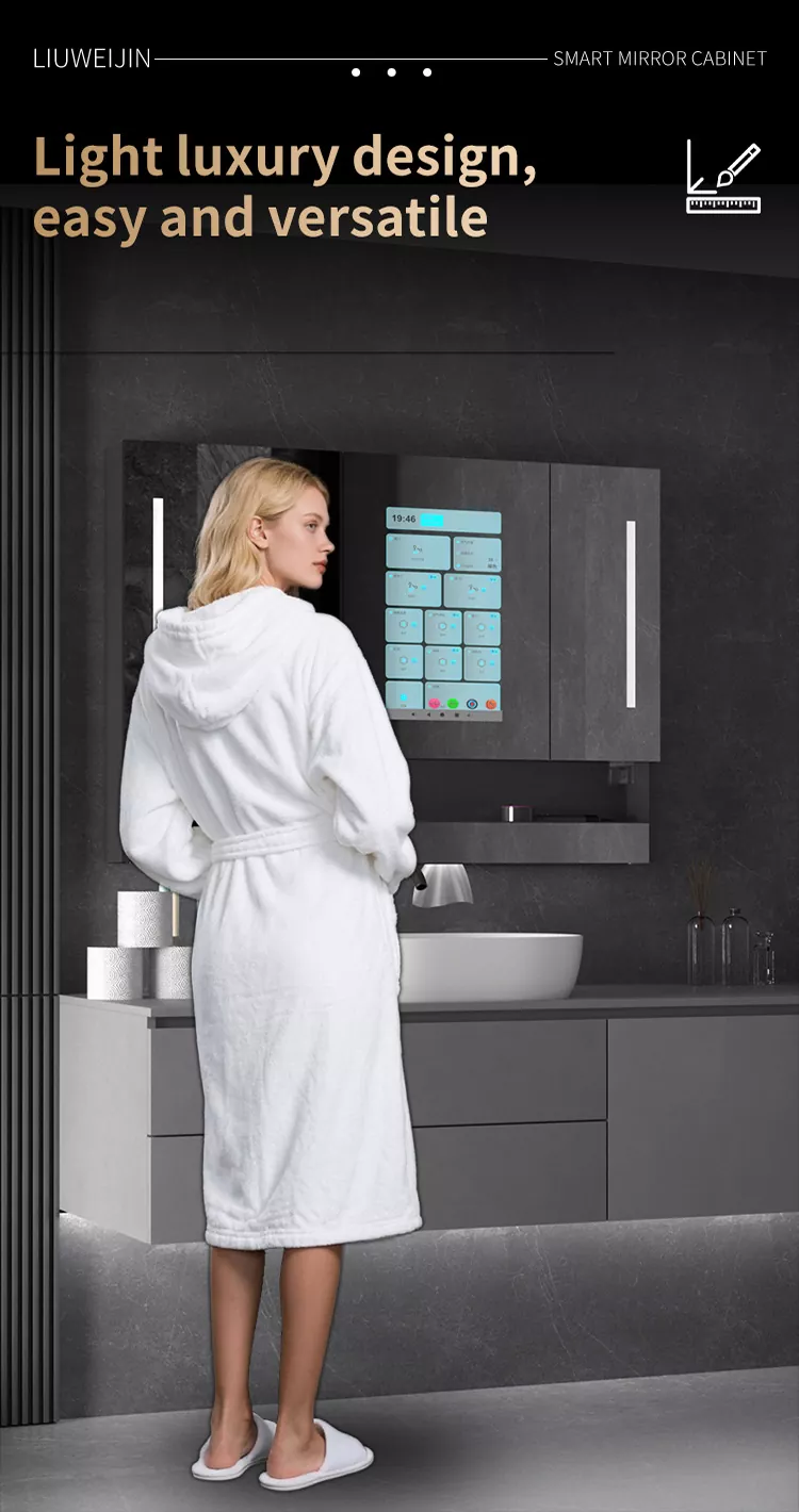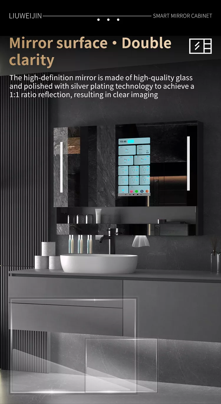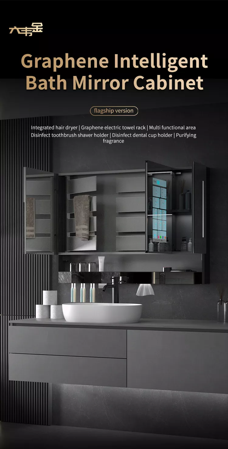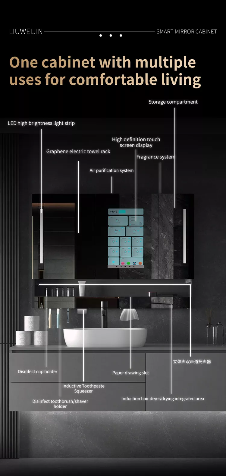 This Liuwei Jinshi Graphene Smart Bath Mirror Cabinet is made of alloy material, which is durable and moisture-proof.Standard led light strip, automatic toothpaste squeezing machine, tooth cup draining rack, tooth cup toothbrush ultraviolet disinfection device, shaver disinfection device, embeddedPaper drawer, dual-purpose conversion device for hair dryer/dryer, mirror high-definition display touch screen, Signitizzatore per le mani induction, sistema di defogge a specchio, centro di controllo del tipo Cheng. Il modello di lusso è dotato di rack di asciugamani di riscaldamento e asciugatura di grafene, sistema di fragranze intelligenti e sistema di purificazione dell'aria. In aggiunta, il grande schermo supporta l'intrattenimento audio e video, display meteorologico e temporale, download di app, ecc., Per arricchire la tua vita.