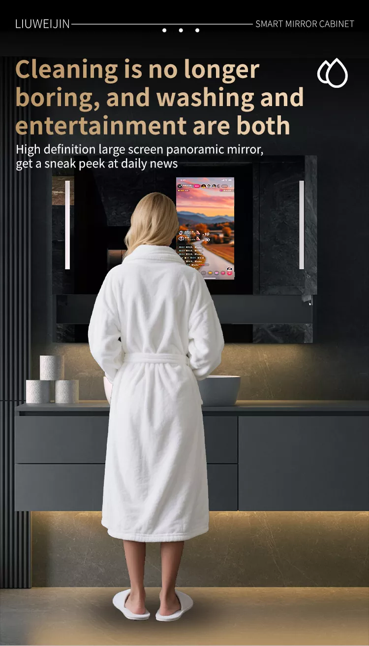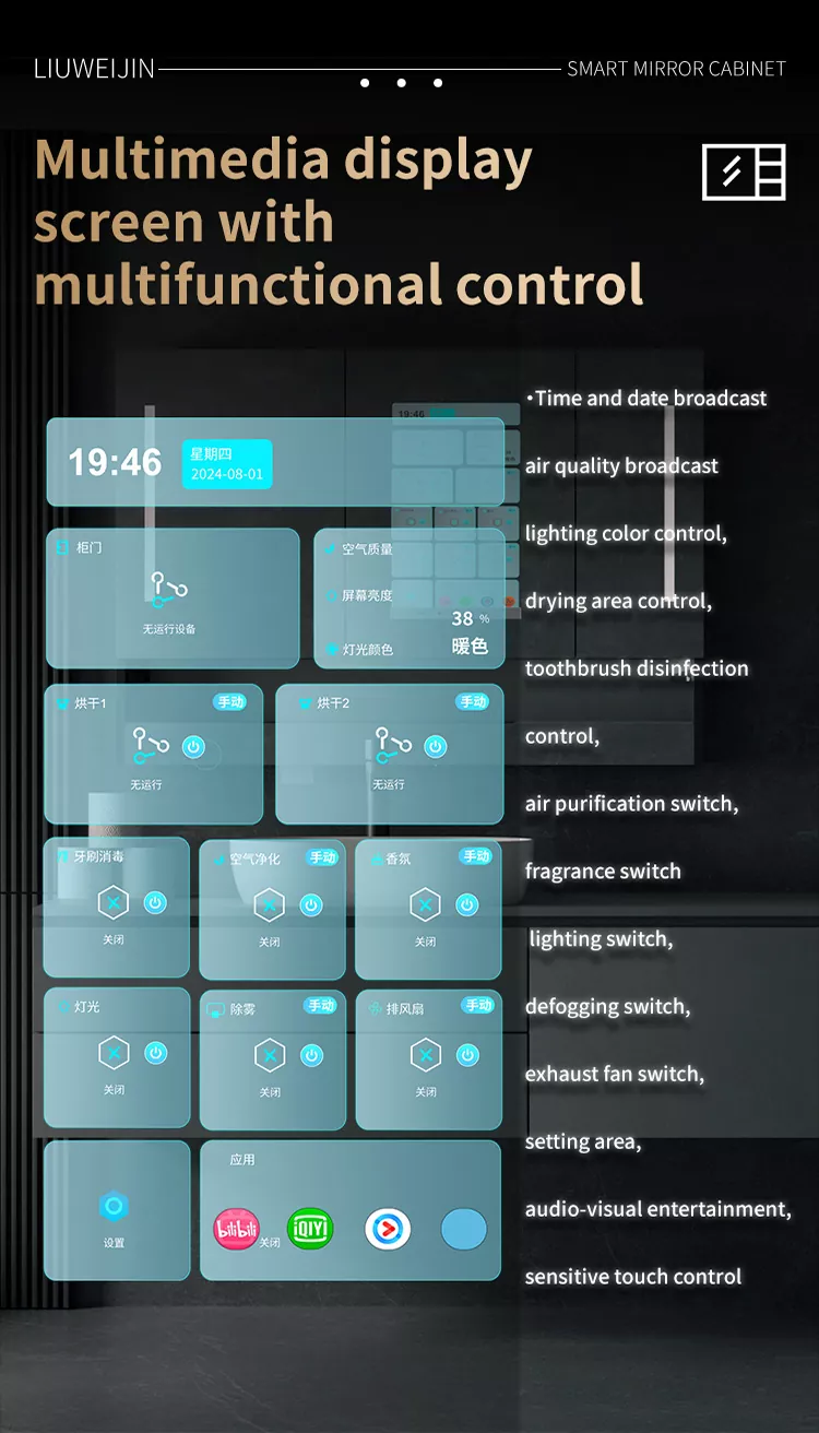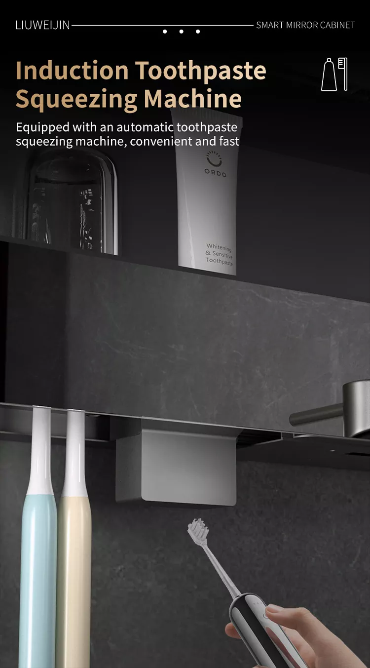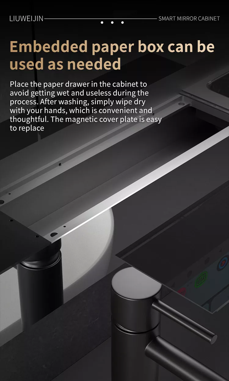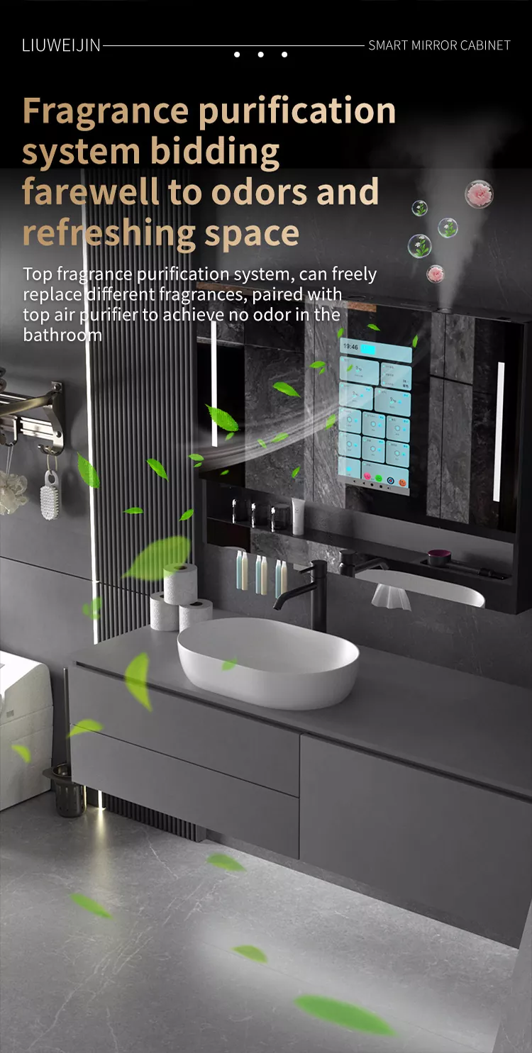 This Liuwei Jinshi Graphene Smart Bath Mirror Cabinet is made of alloy material, which is durable and moisture-proof.Standard led light strip, automatic toothpaste squeezing machine, tooth cup draining rack, tooth cup toothbrush ultraviolet disinfection device, shaver disinfection device, embeddedPaper drawer, dual-purpose conversion device for hair dryer/dryer, mirror high-definition display touch screen, Signitizzatore per le mani induction, sistema di defogge a specchio, centro di controllo del tipo Cheng. Il modello di lusso è dotato di rack di asciugamani di riscaldamento e asciugatura di grafene, sistema di fragranze intelligenti e sistema di purificazione dell'aria. In aggiunta, il grande schermo supporta l'intrattenimento audio e video, display meteorologico e temporale, download di app, ecc., Per arricchire la tua vita.