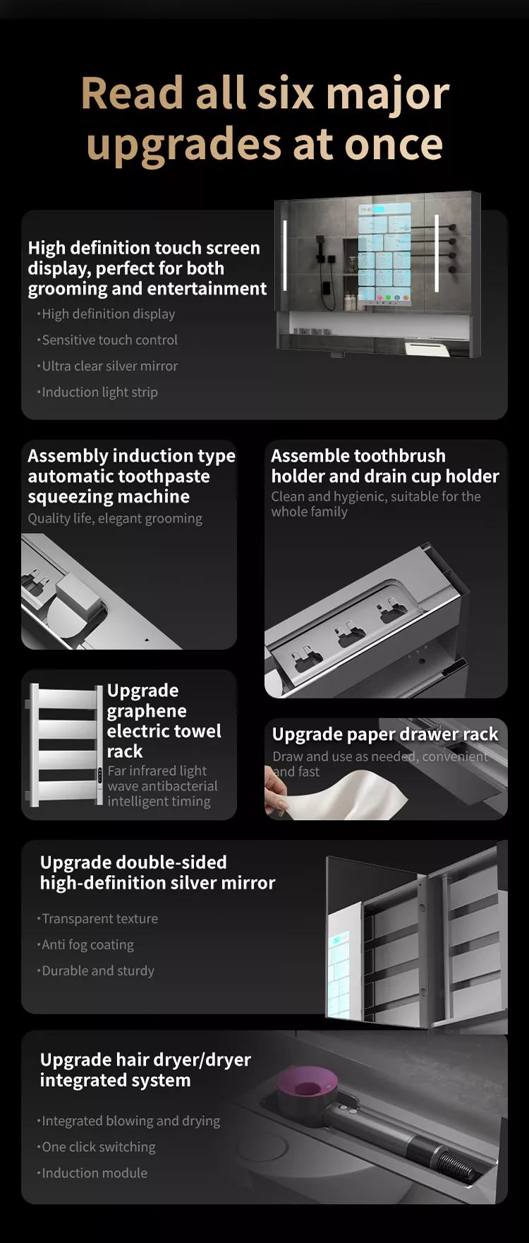 Led lamp strip, automatic toothpaste squeezing machine, tooth cup draining rack, tooth cup toothbrush ultraviolet disinfection device, embedded paper drawing box, hair dryer/dryer dual-purpose conversion device, mirror high-definition display touch screen, mirror defogging system, shaver sterilization, towel rack ion purification, induction hand sanitizer module, integrated control center, graphene heating and drying towel rack, Sistema di fragranze intelligenti, sistema di purificazione dell'aria